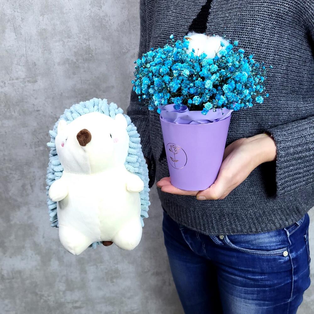 Голубой мини ёжик со стаканчиком гипсофилы в Юже
