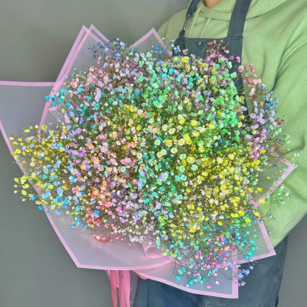 Букет из гипсофилы, созданный с безупречным умением и тонкостью, эффектно дополнит любой интерьер своей изумительной красотой. Радужная гипсофила символизирует любовь и красоту, что позволяет выразить свои самые глубокие чувства и нежность. Этот букет станет яркой декорацией … Показать ещёлюбого торжества или праздника. Такая композиция подойдет для тех, кто не боится проявлять свою индивидуальность и желает порадовать себя или своих близких искренними и нежными эмоциями. Оригинальный букет из радужной гипсофилы – это настоящая находка для тех, кто ищет яркие эмоции, эксперименты и оригинальность в жизни!